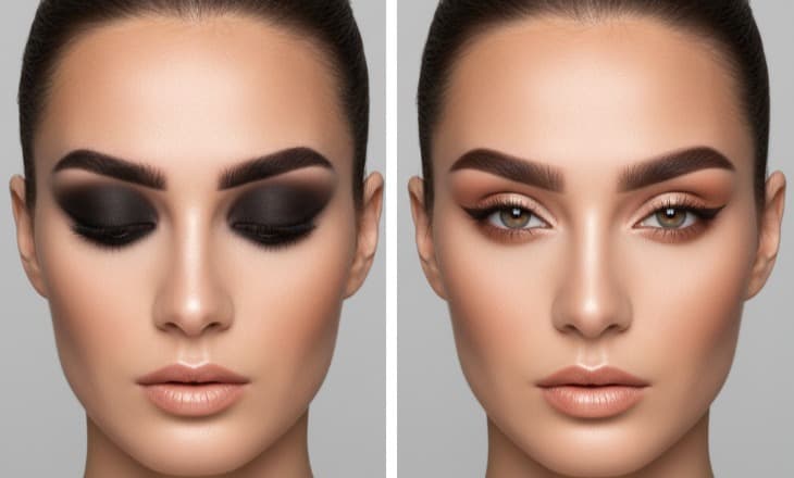 🔸 سایههای تیره و مات روی کل پلک سایه دودی سنگین و تمامپلک، به خصوص در میکاپ روزانه، چشمها را کوچک، بسته و سندارتر نشان میدهد. ✔ انتخاب هوشمندانه: از رنگهای روشن، هلویی، برنزی یا سایههای براق خیلی لطیف استفاده کنید تا پلک بازتر و شادابتر دیده شود.